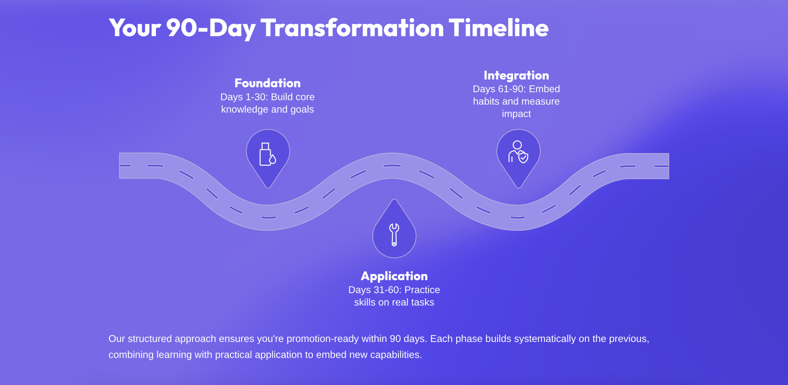 Our structured approach ensures you're promotion-ready within 90 days. Each phase builds systematically on the previous, combining learning with practical application to embed new capabilities.